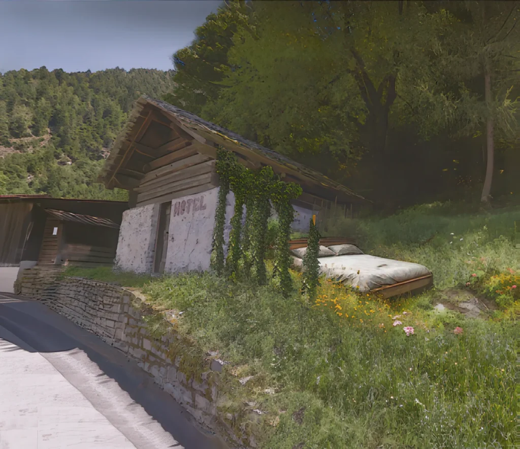 Wir möchten unsere Vision partizipativ entwickeln & das diese danach von der Bevölkerung weitergetragen werden kann. Das Gebäude soll reaktiviert werden als Hotel: Innen wird eine Reception & botanische Erinnerungs-Sammlung von Gästen & Anwohner eingerichtet. Im Garten wird ein Hotelzimmer mit gespendeten Möbeln & Pflanzen ausgestaltet.