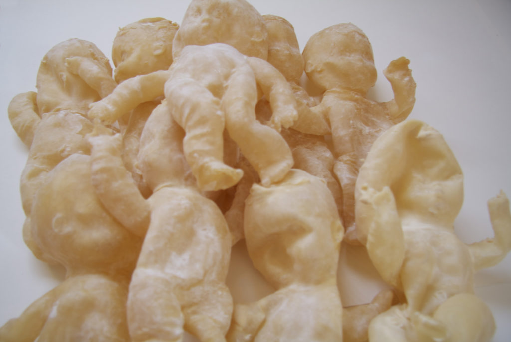 Aus Latex kreierte ich eigene Putten. Meine alte Lieblingspuppe war Model dafür. Es entstanden 34 Latexhüllen, welchen ich mit Füllmaterial Leben einhauchte. Meine Putten waren nackt und hatten weder Flügel, Haare noch irgendwelche Gegenstände. Einzig ihre Funktion blieb die ursprüngliche, sie sollten verführen. Jede Putte hatte einen individuellen Ausdruck und war in Farbigkeit und in der Formvollendung subtil verschieden.